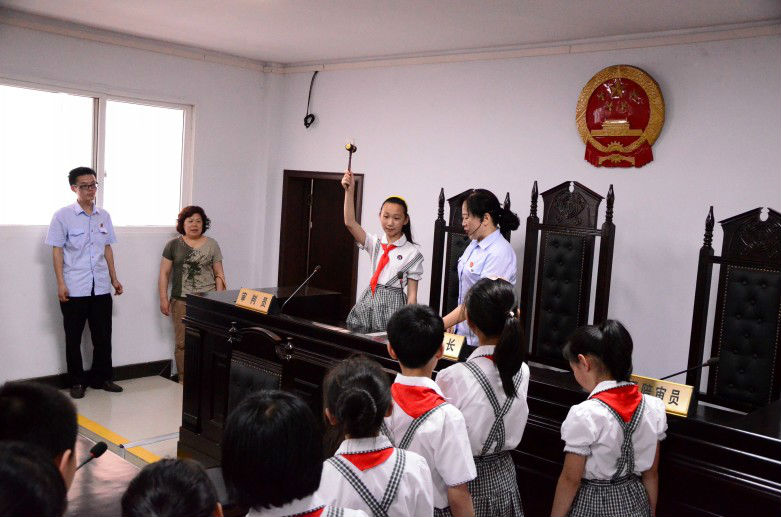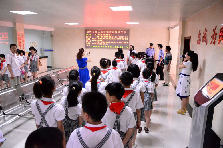 6月6日下午,老河口市人民法院举办了一次别开生面的法院开放日活动,来自老河口市第八小学的50名四年级学生代表,在法院导诉员的详细讲解下,参观了法院的诉讼服务中心、文化走廊、民事、刑事审判办公室,近距离感受未成年人圆桌审判,亲眼目睹法官身着法袍审判的形象。在法院的刑事审判庭,学生们坐在审判席上,头顶国徽,敲击法槌,亲身体验法院的庄重、法庭的威严。