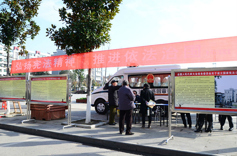 老河口法院积极、慎重的做好首个国家宪法日宣传工作。一是组织法院各业务庭优秀法官,面对面为群众解答诉讼过程中的疑问及难题。二是印发宣传材料,向广大群众普遍开展法制教育,弘扬宪法精神。三是利用巡回审判车,在市区人口集中点流动播放宪法知识、法律条例等常识,营造浓厚的宣传氛围。